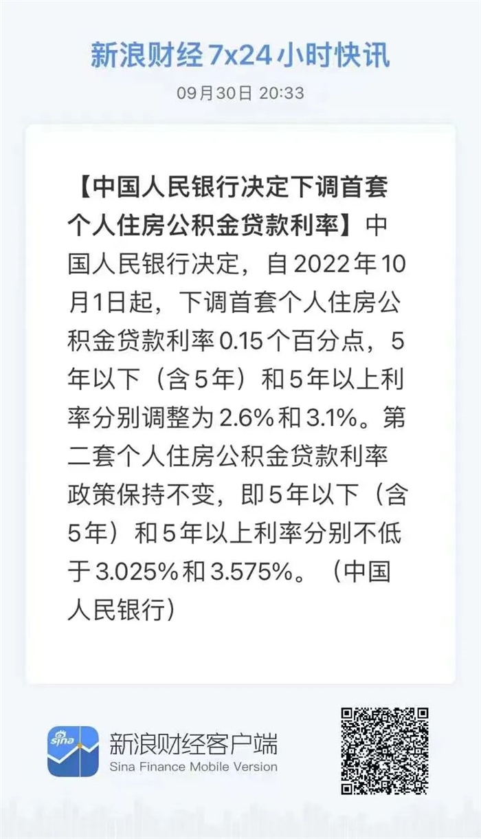 9月30日晚,央行宣布:10月1日起,下调首套个人住房公积金贷款利率0.15个百分点,5年以下(含5年)和5年以上利率分别调整为2.6%和3.1%;